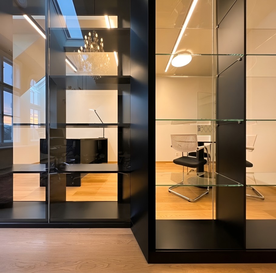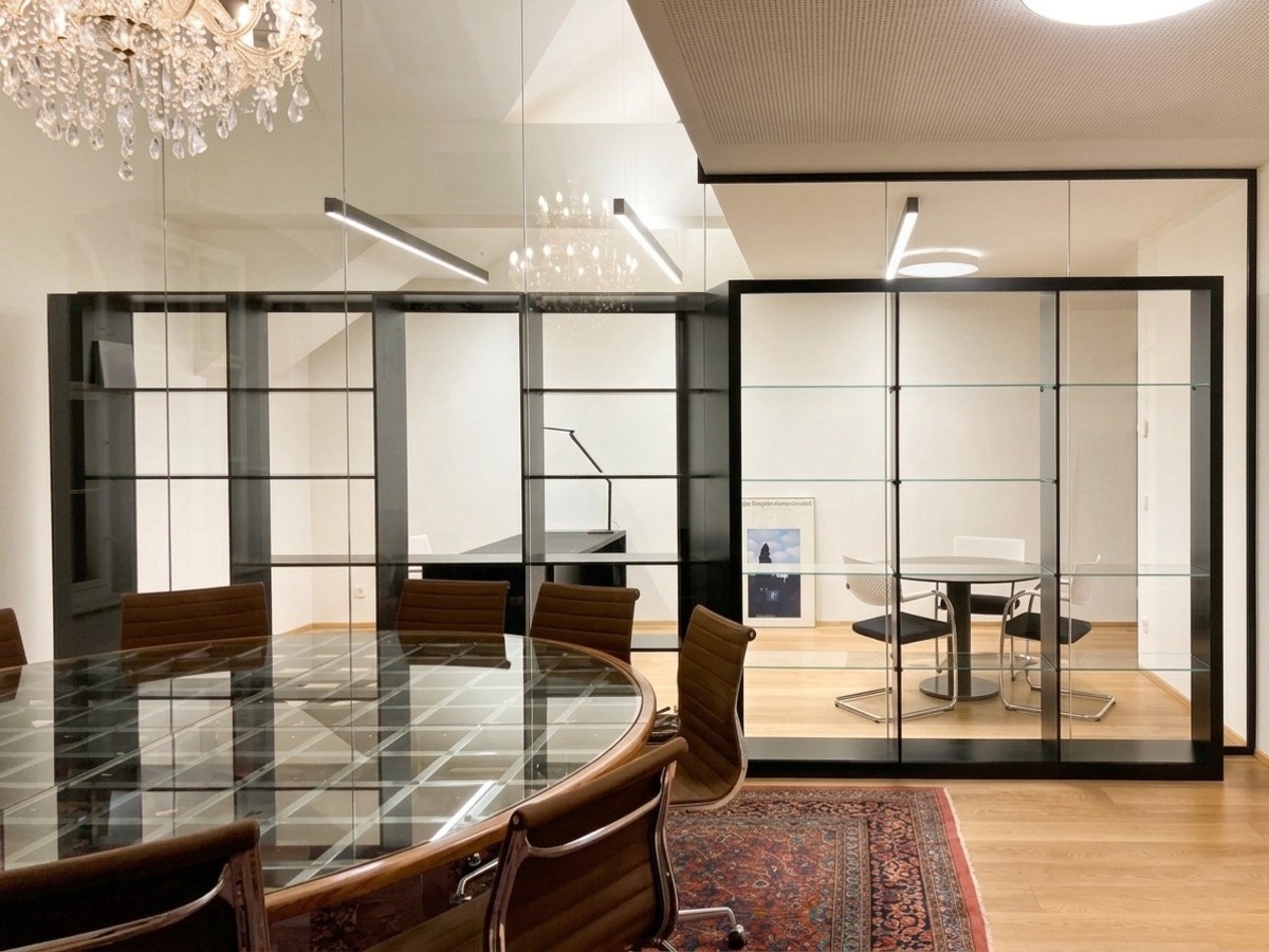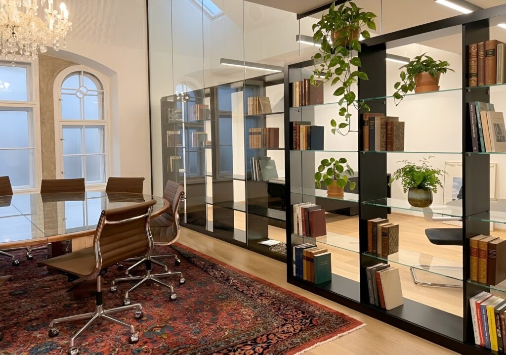 Wir haben maßgefertigte Möbelstücke aus hochwertigen Materialien wie dunklem Holz, Glas und Metall kreiert, die nahtlos in die Architektur des Gebäudes integriert wurden. Im Besonderen wurde auf die Konvektion der Wandheizung Rücksicht genommen, in dem wir hier mit durchlässigen, jedoch ästhetisch wertvollem Flechtmaterial gearbeitet haben. Die Tischlerei umfasste unter anderem offene Regalsysteme für Bücher und Deko-Elemente, Konferenztische sowie funktionale Sideboards und Schreibtische. Um die Räume lebendiger zu gestalten, sind diese mit sorgfältig ausgewählten Kunstgegenständen, Skulpturen und Gemälden kombiniert. Pflanzen und orientalische Teppiche sorgen für eine harmonische Atmosphäre, die den historischen Charme des Hauses mit moderner Funktionalität verbindet.