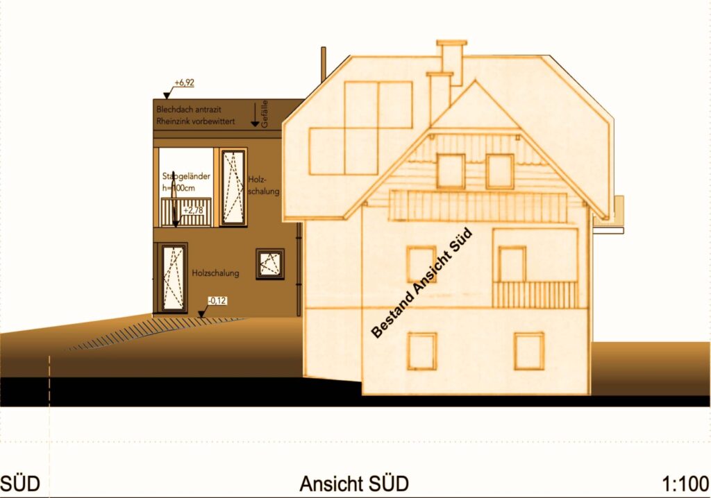 Diesem Einfamilienhaus aus den 60er-Jahren wurde von einem nachträglichen Zubau befreit, so in seine ursprüngliche Baugestalt zurückgeführt und mit einem offensichtlich zeitgemäßen Baukörper erweitert. Zugang, Altbau, Neubau und Terrasse wsollen so in einem funktionieren Kreislauf gebracht werden.